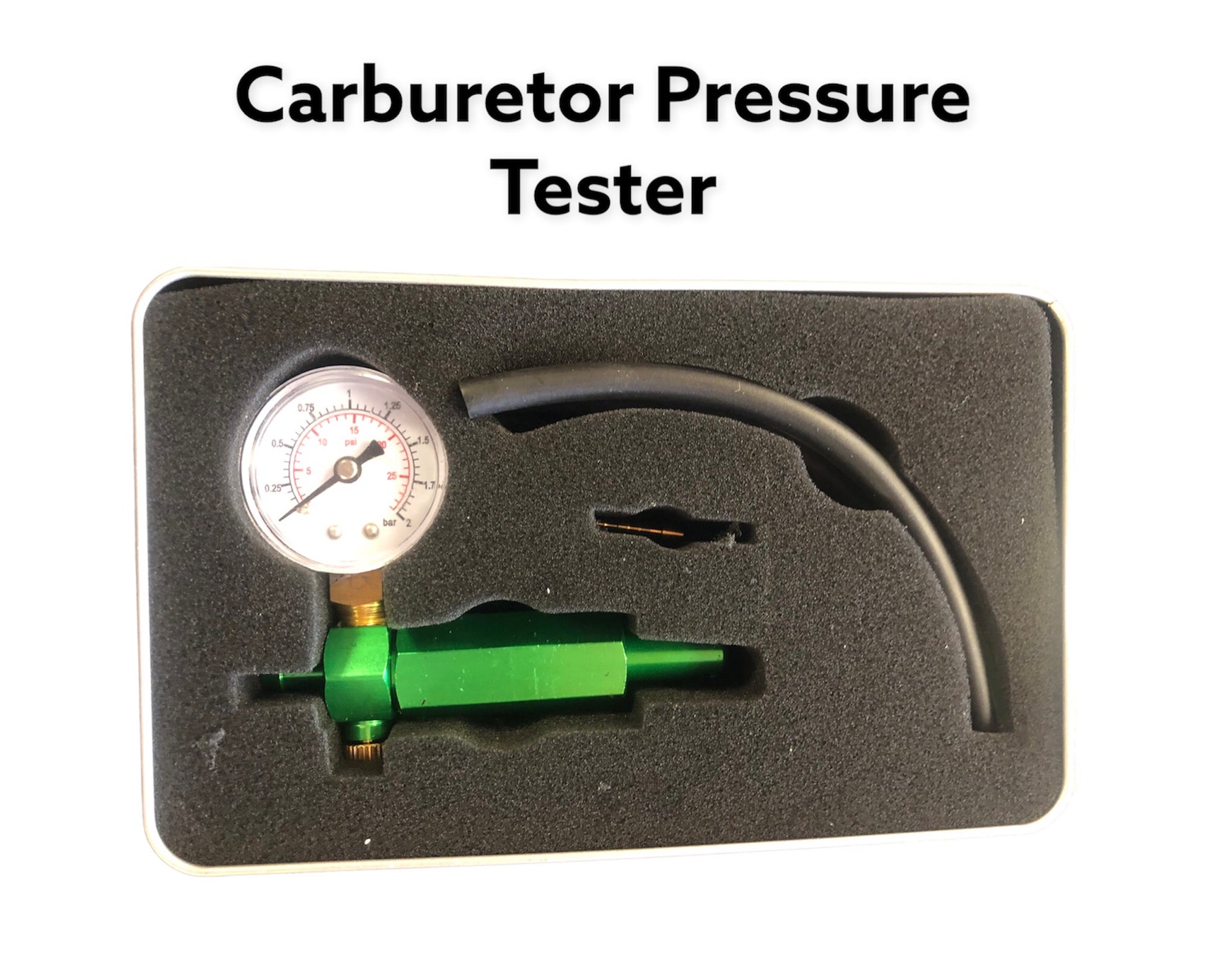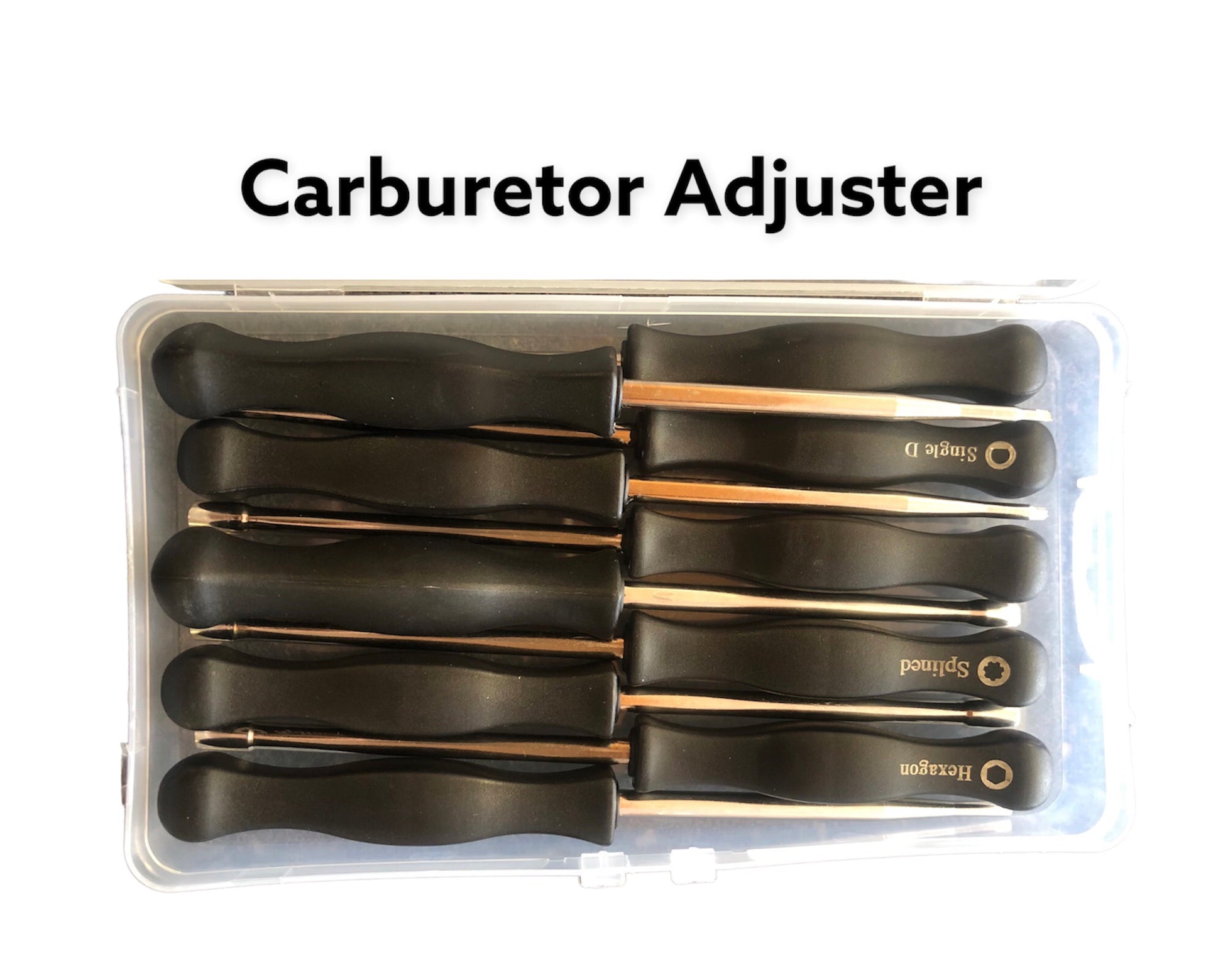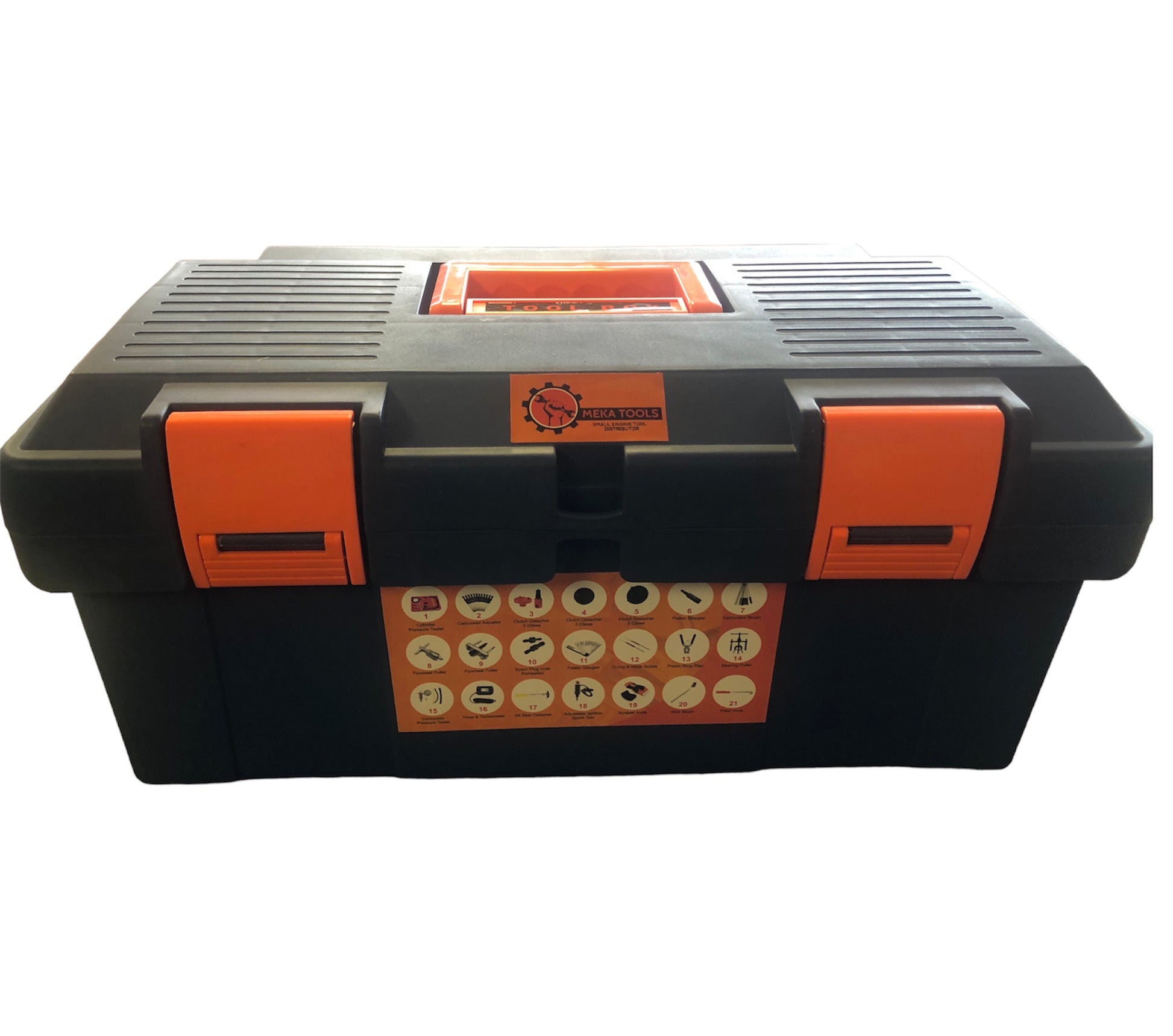 - Caja de herramienta incluye 21 piezas: Cylinder pressure tester, ccarburetor adjusters, clutch detacher claws, piston stopper, carburetor brush, o-ring remover, oil seal detacher, fly wheel detacher, piston ring plier, spark tester, spark hole repairer, bearing detacher, scraper, thickness gauge, carburetor pressure tester, metal brush, tachometer and timer & filter hook.