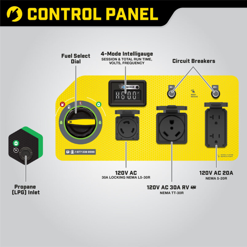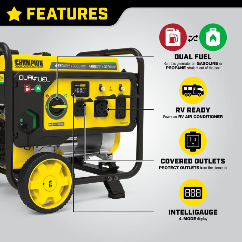 El potente generador RV-Ready de 3650 vatios de Champion cuenta con combustible dual, lo que permite que el motor de 224 cc funcione con gasolina o propano. Con tecnología Intelligauge, Volt Guard™ y arranque en frío, proporciona hasta 14 horas de funcionamiento con gasolina o 10.5 horas con propano.